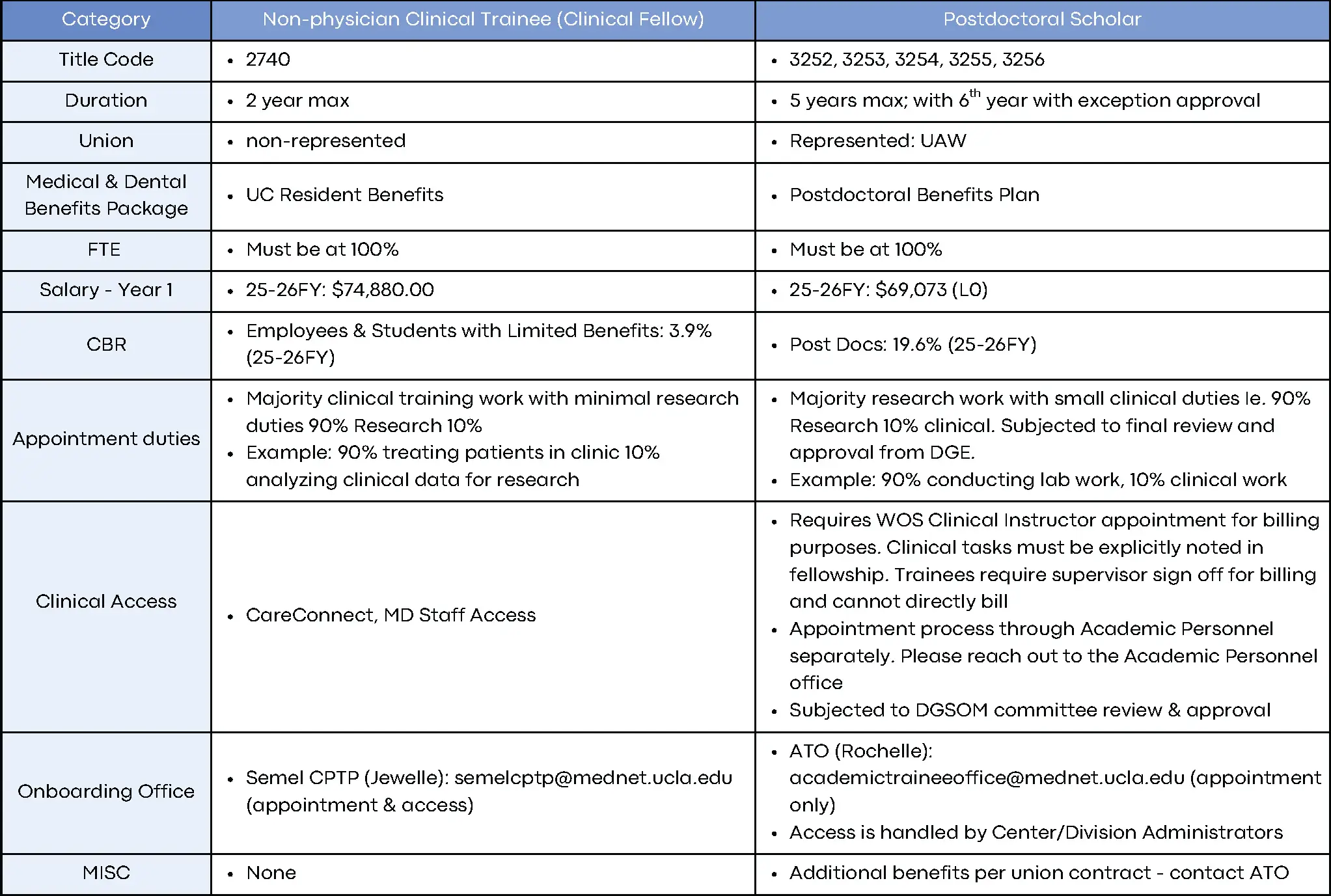 Faculty, Staff, Supervisors Clincal Fellow vs Postdoctoral Scholar Practicum Internship Fellowship New Fellowship Track Proposals